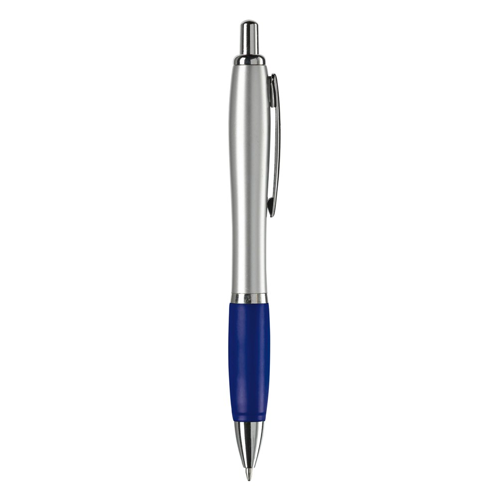 Stilvoller silberfarbener Kugelschreiber mit farbigen Griff. Metallclip, Drücker, Zwischenring und Spitze. Blauschreibende Jumbo-Mine mit langer Schreibleistung.