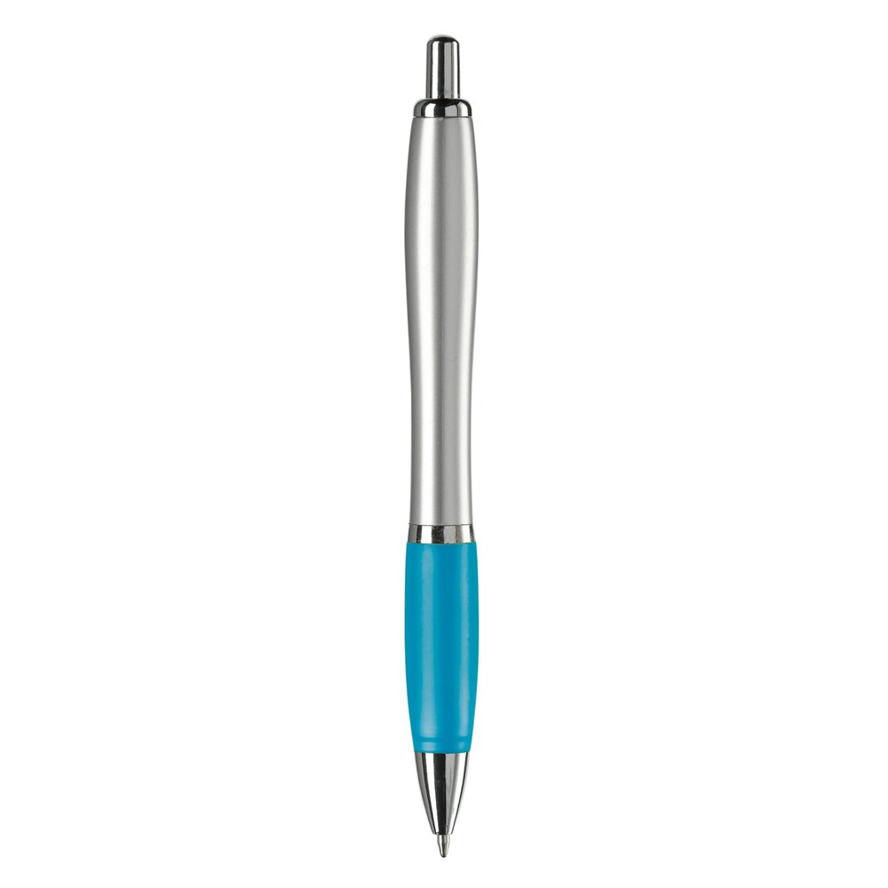 Stilvoller silberfarbener Kugelschreiber mit farbigen Griff. Metallclip, Drücker, Zwischenring und Spitze. Blauschreibende Jumbo-Mine mit langer Schreibleistung.