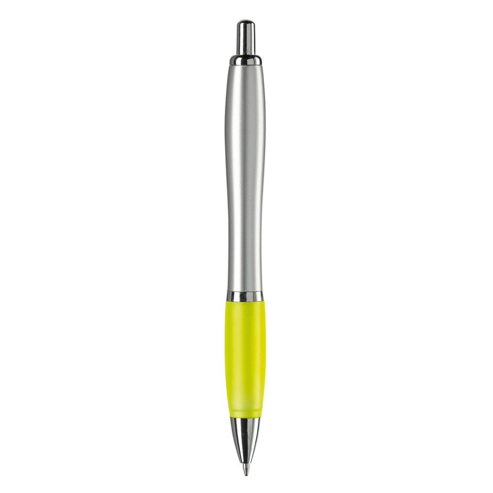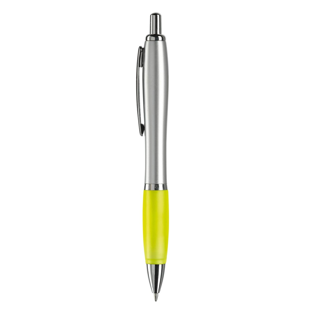 Stilvoller silberfarbener Kugelschreiber mit farbigen Griff. Metallclip, Drücker, Zwischenring und Spitze. Blauschreibende Jumbo-Mine mit langer Schreibleistung.