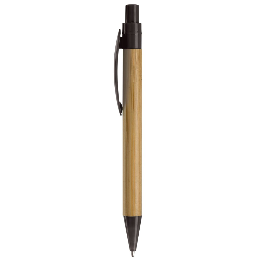 Bambuskugelschreiber mit Clip in Blattform. Farbiger Drücker und Unterteil, ausgestattet mit einer X20-Mine mit schwarzer Tinte. Bedruckung auf dem Clip möglich.