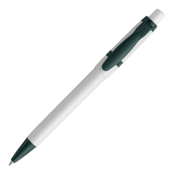 Hardcolour ball pen Olly with white body and coloured clip. Including a Jumbo refill with blue writing ink. The pen has a pusher mechanism and is made of ABS, made in Europe. From 5.000 pieces other writing colours possible.