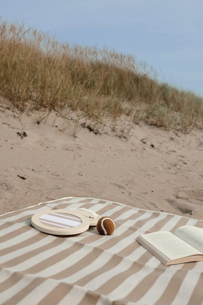 This is the ideal outdoor game to bring to the beach or park. It includes one ball and two velcro catchers, crafted from FSC® certified plywood. The design is sporty yet refined, featuring a two-tone striped pattern on the catchers and a matching brown ball. The game is conveniently packed in a canvas bag with a mesh back making it easy to bring along. Instruction leaflet is included.