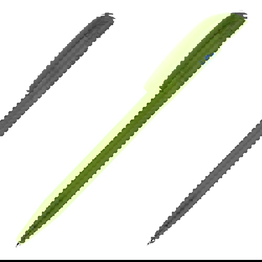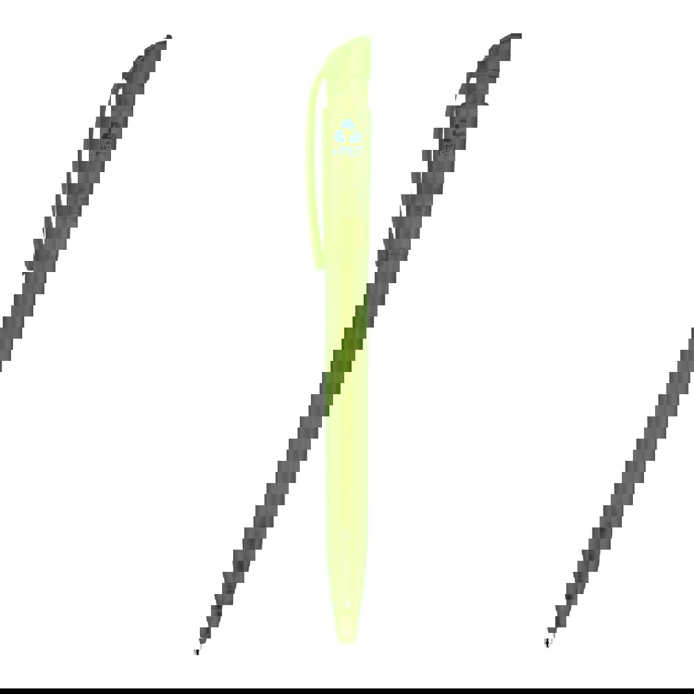 Modern transparent ball pen with bow clip made of R-PET material. R-PET means recycled PET plastic. With a big imprint space, it is a nice advertising item. It includes a pusher mechanism and a X20 refill with blue writing ink.