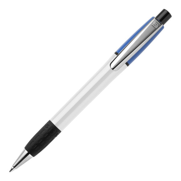 The classic and elegant hardcolour Semyr ball pen with white body and coloured top. The grip, pusher and ring in the barrel are black. The pen comes with a Jumbo refill with blue writing ink. The pen has a pusher mechanism and is made of ABS, made in Europe. From 5.000 pieces own colour combinations possible.