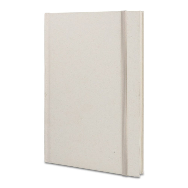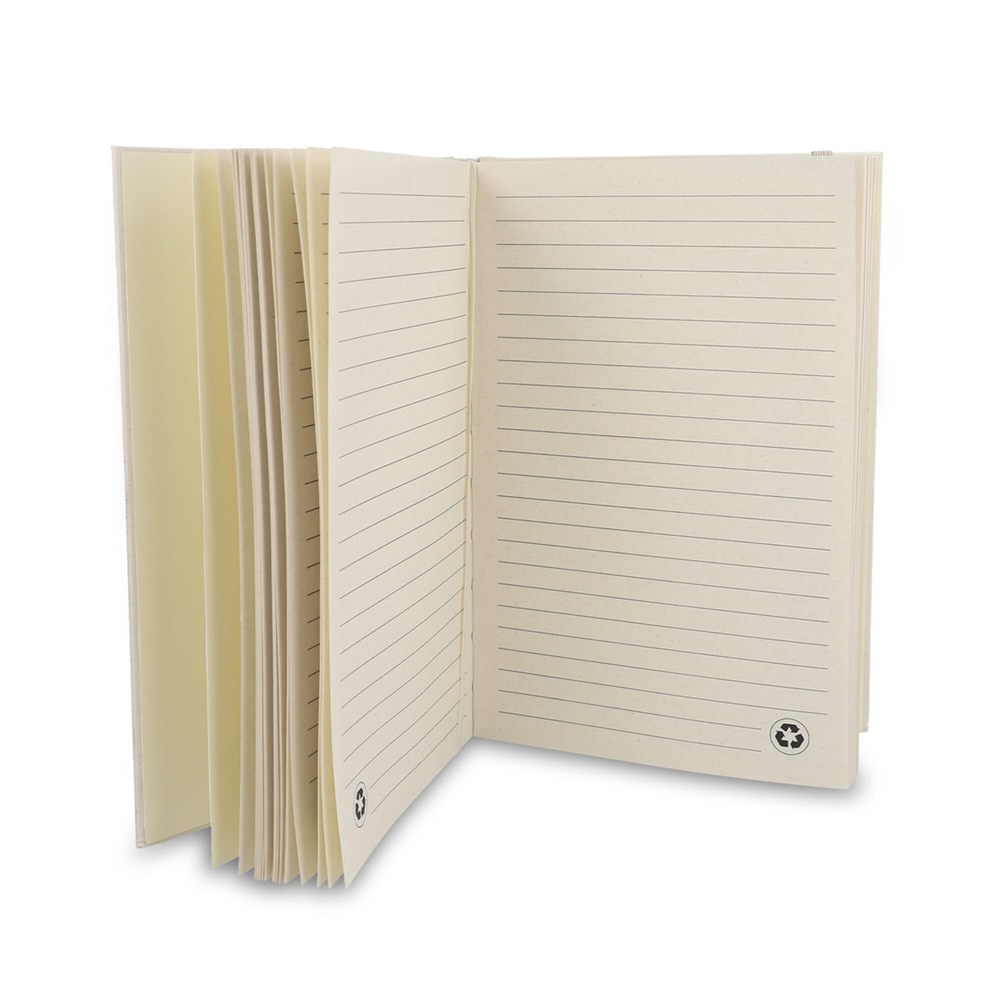 This sustainable A5 notebook features a cover made from recycled 120gsm milk carton paper. It contains 80 sheets of 70g/m² lined recycled milk carton paper, with an elastic band closure and a ribbon bookmark.