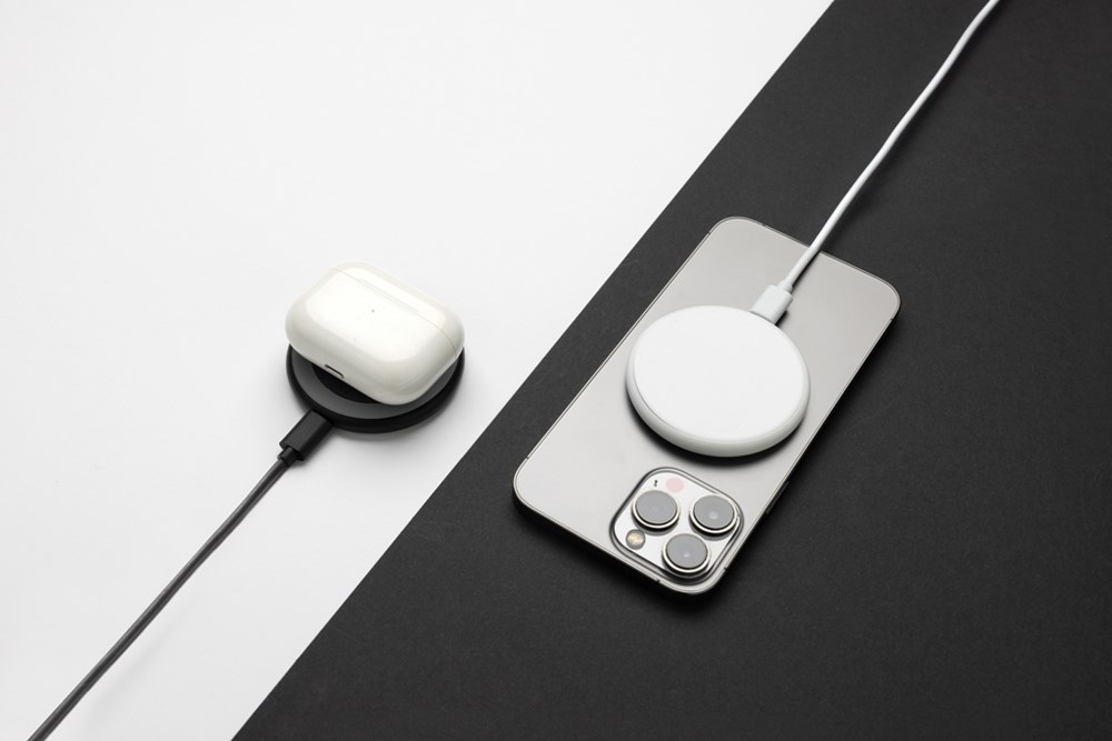 Unique design 15W magnetic wireless charger that gives you the option to charge either your mobile device, earbuds or iWatch. Simply click them on and start charging. Made with recycled ABS and recycled TPE. Total recycled content: 35% based on total item weight. RCS certification ensures a completely certified supply chain of the recycled materials. Including 120 cm USB A to USB C charging cable made from RCS certified recycled TPE. Packed in FSC® packaging. PVC Free. Output 9V.2.2A Output watch: 9V/0.4A, Output earbuds: 9V/0.5A. Input 9V/3A.