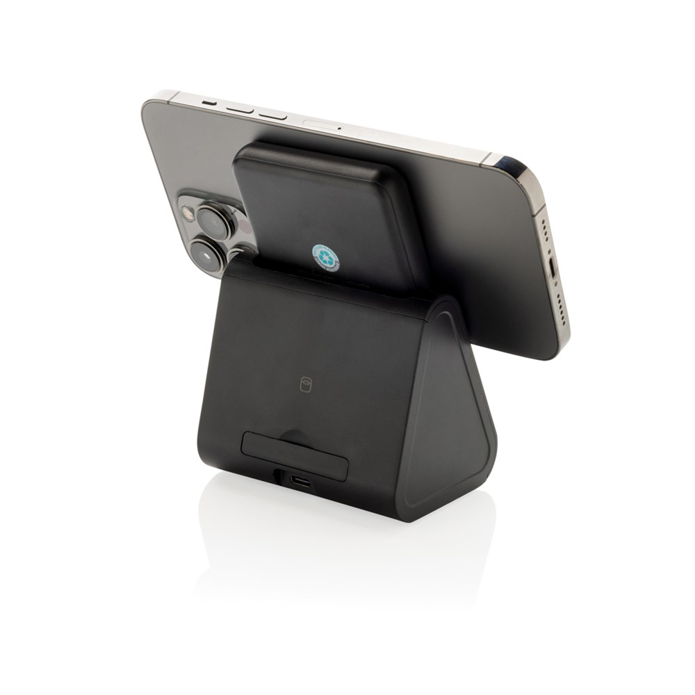 3-in-1 wireless charger with powerbank dock made with RCS, ABS and RCS recycled PC. When you are at home or work use the stand to charge your mobile devices. When you have to go somewhere simply take out the magnetic powerbank from the dock and click it on your phone. Total recycled content: 59% based on total item weight. RCS certification ensures a completely certified supply chain of the recycled materials. The wireless charger comes equipped with a magnetic 5W wireless charger and an additional 5W wireless charger suitable for earbuds cases or other small wireless chargeable devices and a 2.5W wireless charger for smartwatches ( Apple watches only). Including RCS certified 120 cm recycled TPE cable. Packed in FSC® mix packaging. Item and accessories 100% PVC free. Input: 5V/2.4A for optimal use. Output: Phone: 5V/1A Earbuds: 5V/1A, Watch: 5V/0.5A. PVC free.