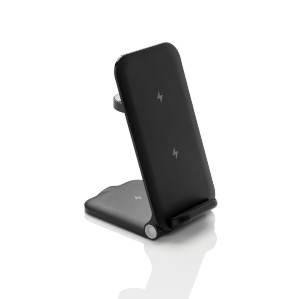 3-in-1 wireless charger stand made with RCS recycled ABS. Total recycled content: 51% based on total item weight. RCS certification ensures a completely certified supply chain of the recycled materials. The wireless charger comes equipped with a 15W wireless charger and an additional 5W wireless charger suitable for earbuds cases or other small wireless chargeable devices and a 2.5W wireless charger for smartwatches ( Apple watches only). Foldable design so easy to take with you. Including RCS certified 120 cm recycled TPE cable. Packed in FSC® mix kraft packaging. Item and accessories 100% PVC free. Input: 9V/3A for optimal use. Output: Phone: 9V/1.1A; 9V/1.67 A/(15W), Earbuds: 5V/1A (5W), Watch: 5V/0.5A.