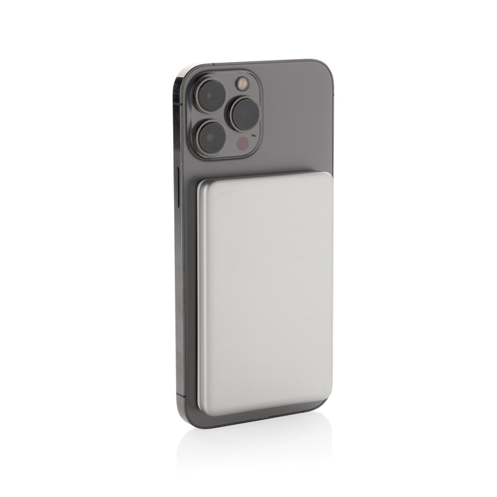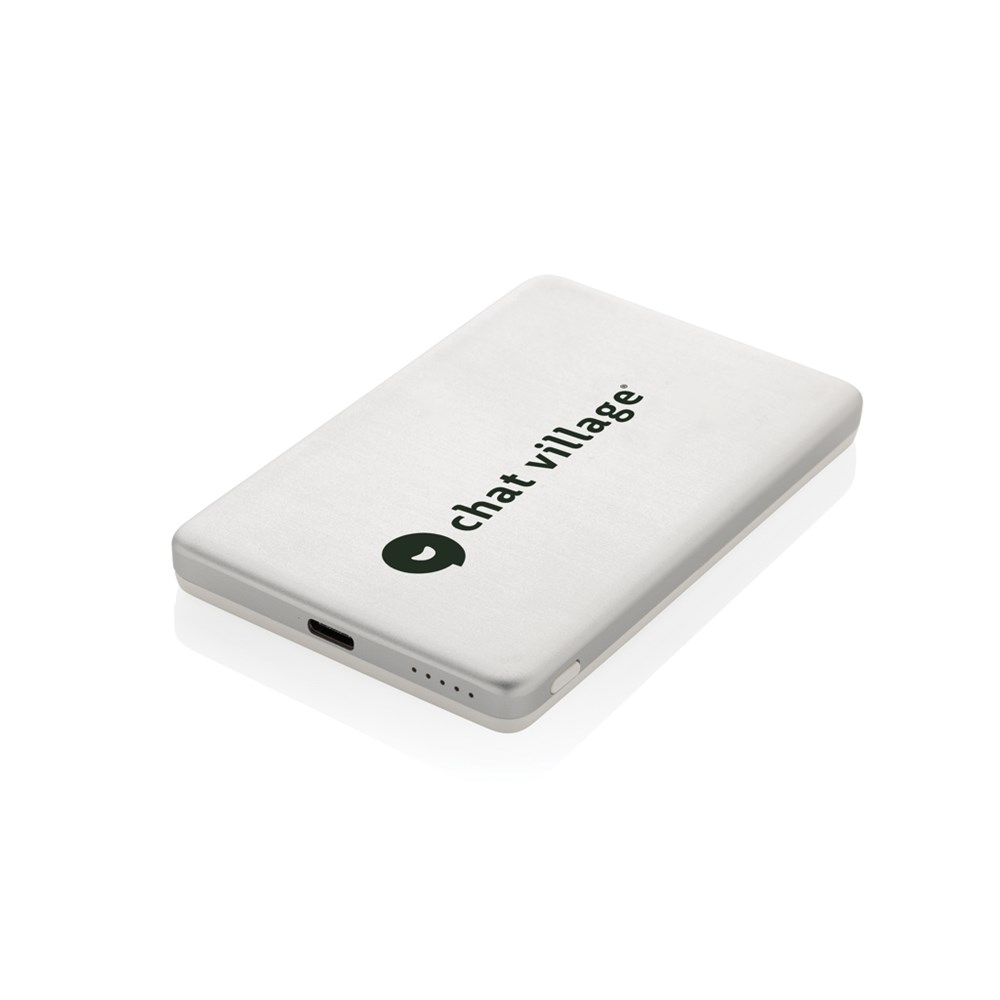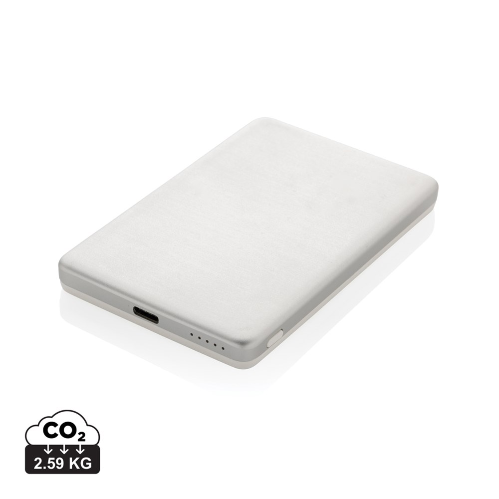5.000 mAh ultra thin powerbank with 5W magnetic wireless charger where the case is made out of RCS certified recycled aluminum and recycled ABS plastic. RCS (Recycled Claim Standard) is a standard to verify the recycled content of a product throughout the whole supply chain. Total recycled content: 23 % based on total item weight. The powerbank contains a long lasting grade A 5.000 mAh lithium polymer battery. The power indicators will indicate the remaining energy level so you always know when to re-charge.; Type-C Input 5V/2.4A; USB C output:5V/2A.4A Item and accessories PVC free. Including RCS certified recycled TPE charging cable. Packed in FSC® mix packaging.