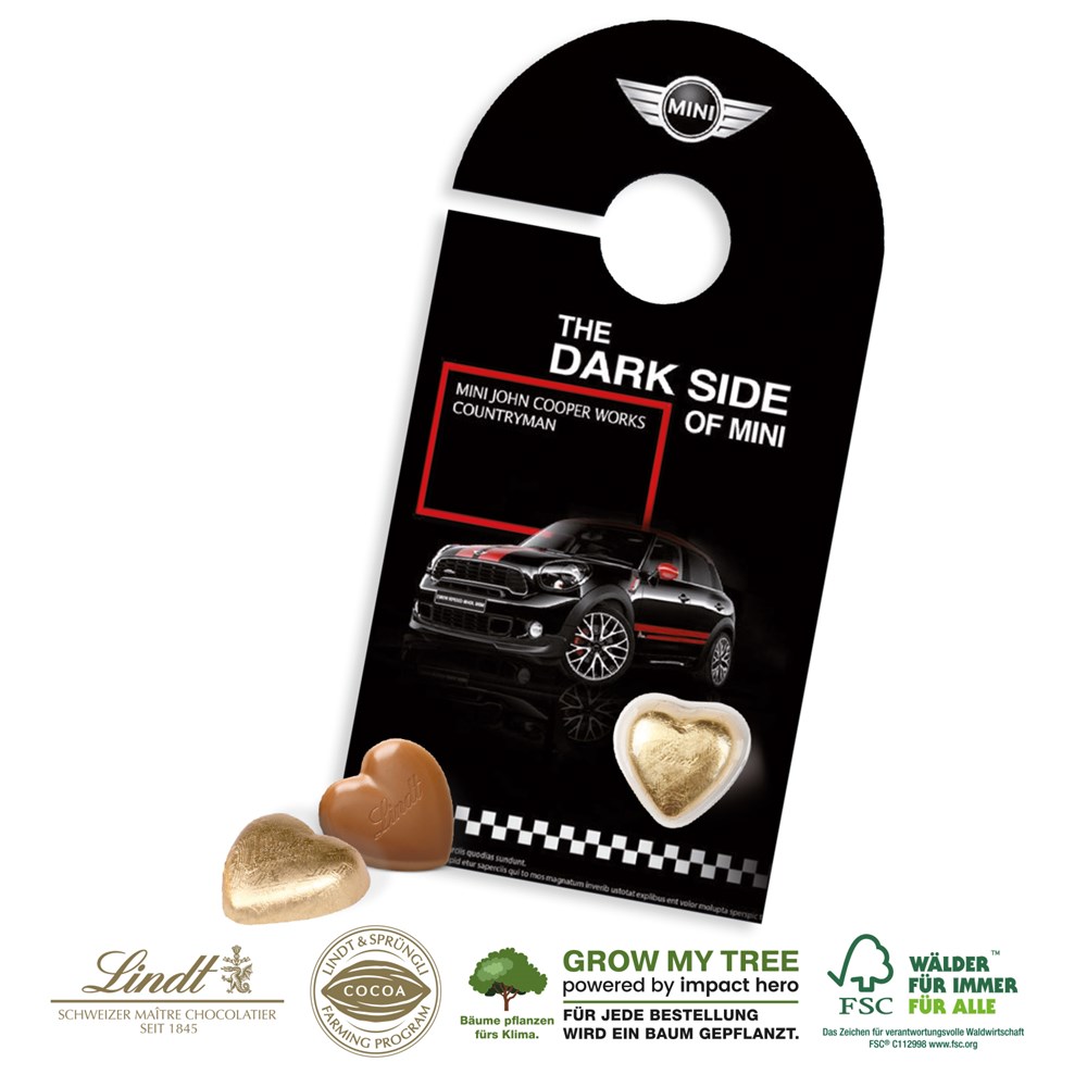 Kreativ, individuell und vielseitig! Ihre individuelle Werbebotschaft, kombiniert mit einem zartschmelzenden Lindt Schokoherz. Eine süßer Gruß mit Genussmoment! Sie wählen die Form: Ob rund, rechteckig, in Herzform oder als Anhänger, damit wird Ihre Werbeaktion zum Volltreffer. Produktdetails: Schokokarte, individuell bedruckt, mit Markenschokoladevon Lindt. Im Frischeblister aus 80 % recyceltem Material. Nachhaltigkeit: Für jede Bestellung mit uns wird ein Baum über GROW MY TREE gepflanzt. Wir verwenden FSC® zertifizierten Karton aus nachhaltiger Forstwirtschaft und anderen kontrollierten Quellen.