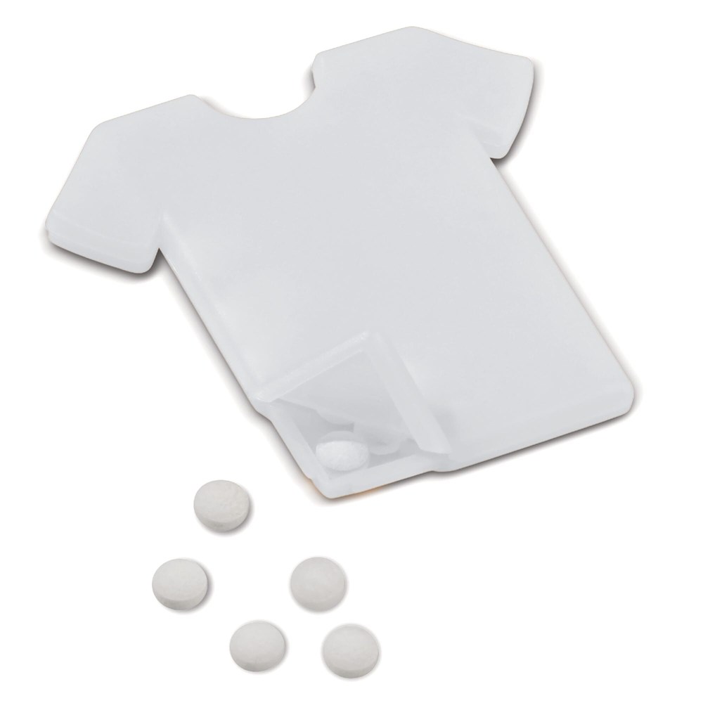 Pfefferminzspender in T-Shirt Form. Die Öffnung befindet sich am unteren Rand des T-Shirts. Ca. 7g zuckerfreies Pfefferminz. Der Artikel kann vollfarbig digital bedruckt werden. Produktspezifikationen auf der Rückseite des Spenders.