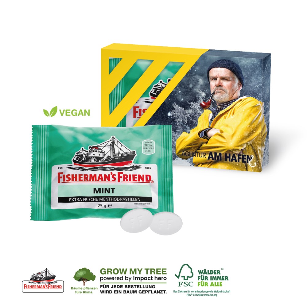 Frische Werbung! Genialer Geschmack und unverschämt frisch! Für alle, die Frische einmal anders erleben wollen. Produktdetails: Individuell bedruckbare Werbekartonage, gefüllt mit Fisherman´s Friend. Nachhaltigkeit: Für jede Bestellung mit uns wird ein Baum über GROW MY TREE gepflanzt. Wir verwenden FSC® zertifizierten Karton aus nachhaltiger Forstwirtschaft und anderen kontrollierten Quellen.