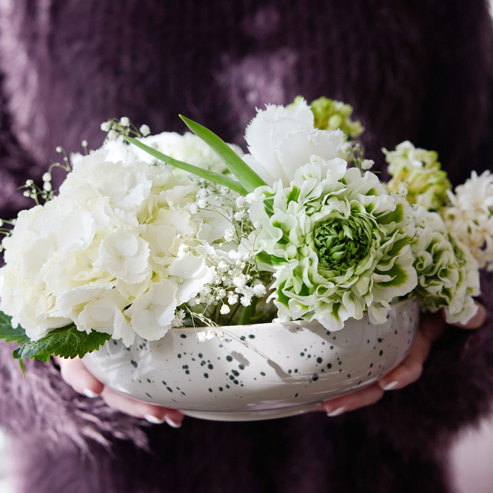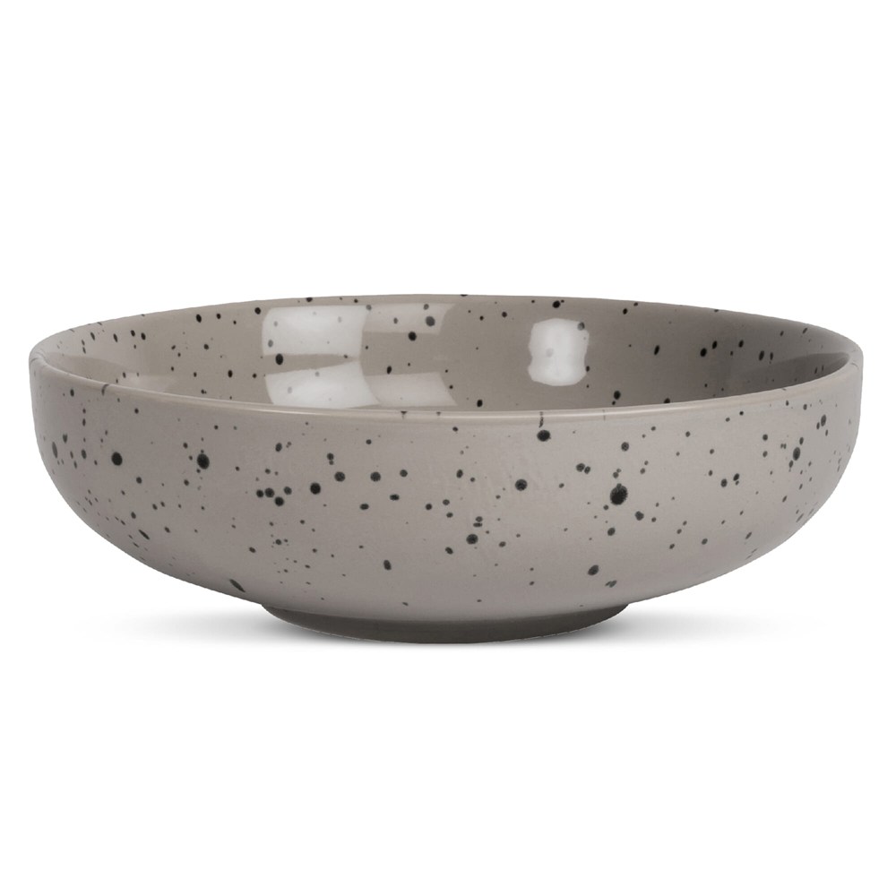 Een grote kom voor snacks of bijgerechten bij het diner. De kleur is een beige/grijze tint met een mooi spattenpatroon in zwart. Deze schaal heeft alleen aan de buitenkant een patroon om harmonie en karakter te creëren tussen de verschillende onderdelen van de serie. Gemaakt van keramiek. Ditte is handgemaakt, de kleur en het oppervlak kunnen daarom per product verschillen. Elk product is uniek in zijn uitstraling.