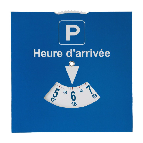 Eine Parkscheibe aus Papier, die den Gesetzen in Frankreich entspricht. Auf der Rückseite der Parkscheibe befindet sich ein großer Druckbereich.