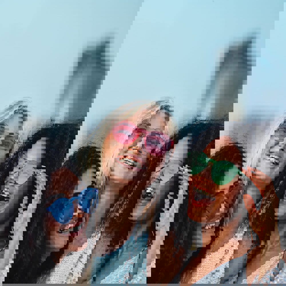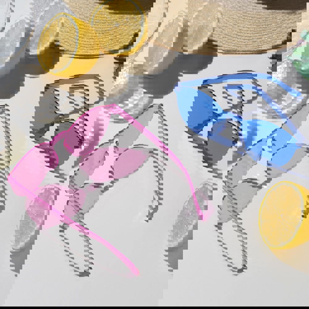 Helle Sonnenbrille im Retro-Stil mit durchgängig transparentem Rahmen und Glas in Pastelltönen. Die Gläser sind mit einem UV400-Filter versehen, was sie zum perfekten Accessoire für das Festivalgelände oder die Stadt macht.